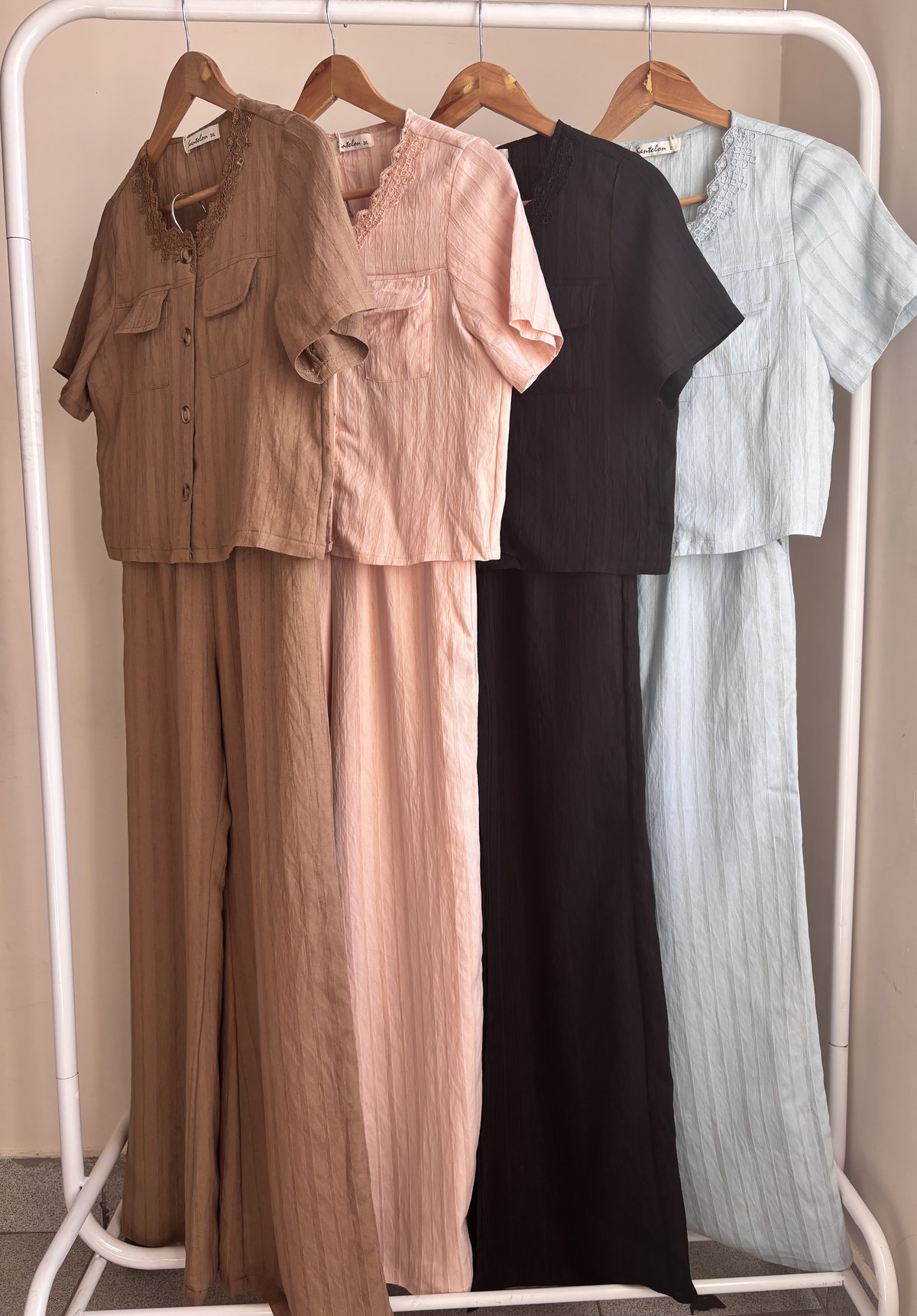 Este set combina elegancia y comodidad gracias a su confección en una mezcla textil que lo hace único : viscosa suave de caída fluida y lino natural que le aporta frescura y textura, es un conjunto ideal para el día o para ocasiones especiales y está pensado para mujeres que buscan un look versátil delicado y cómodo.