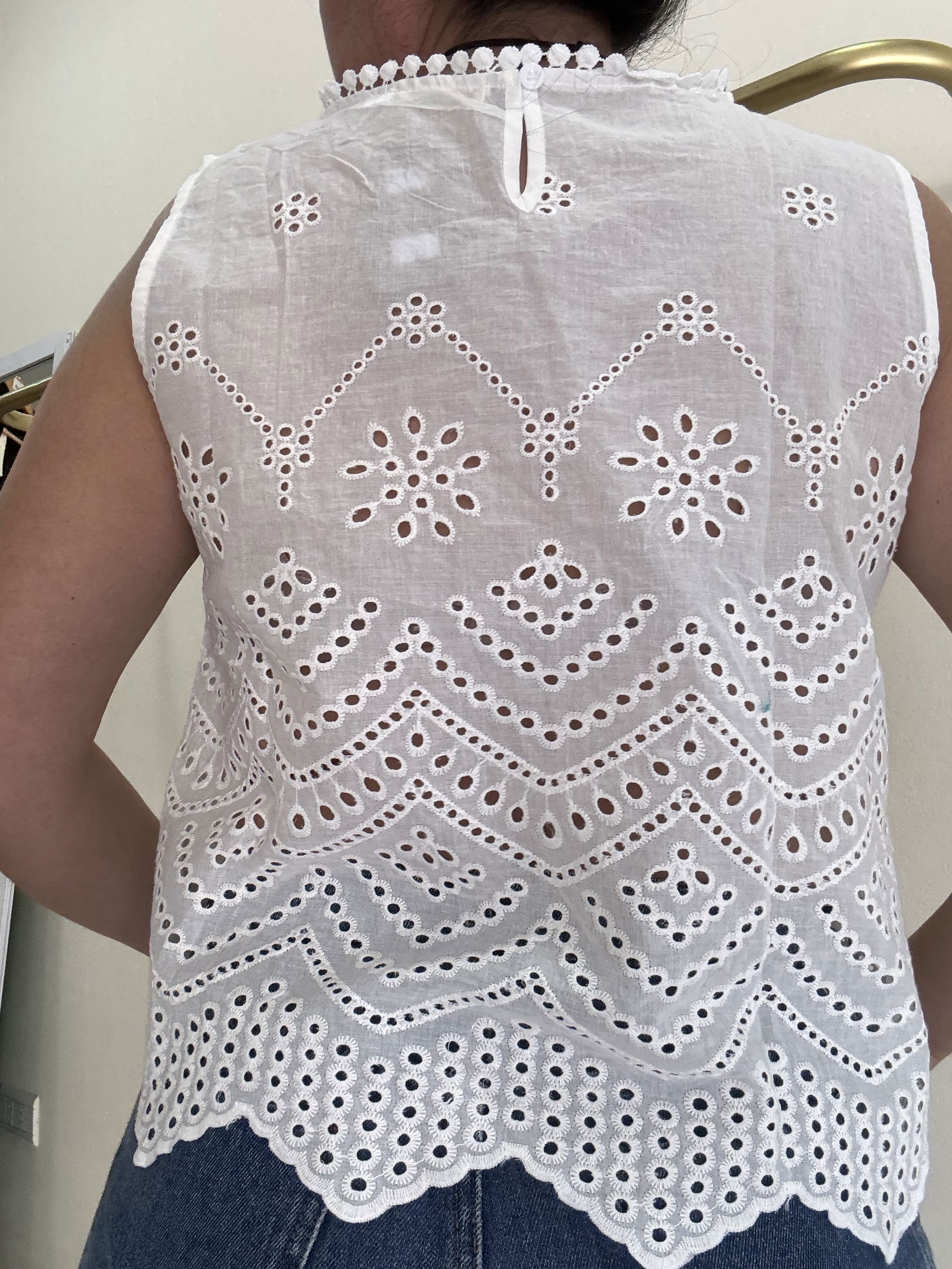 Blusa de Broderie romántica y fresca con calados es perfecta para looks ligeros y femeninos, combínala con jeans para un estilo casual o con un pantalón de lino o sastrero para un outfit más romántico.