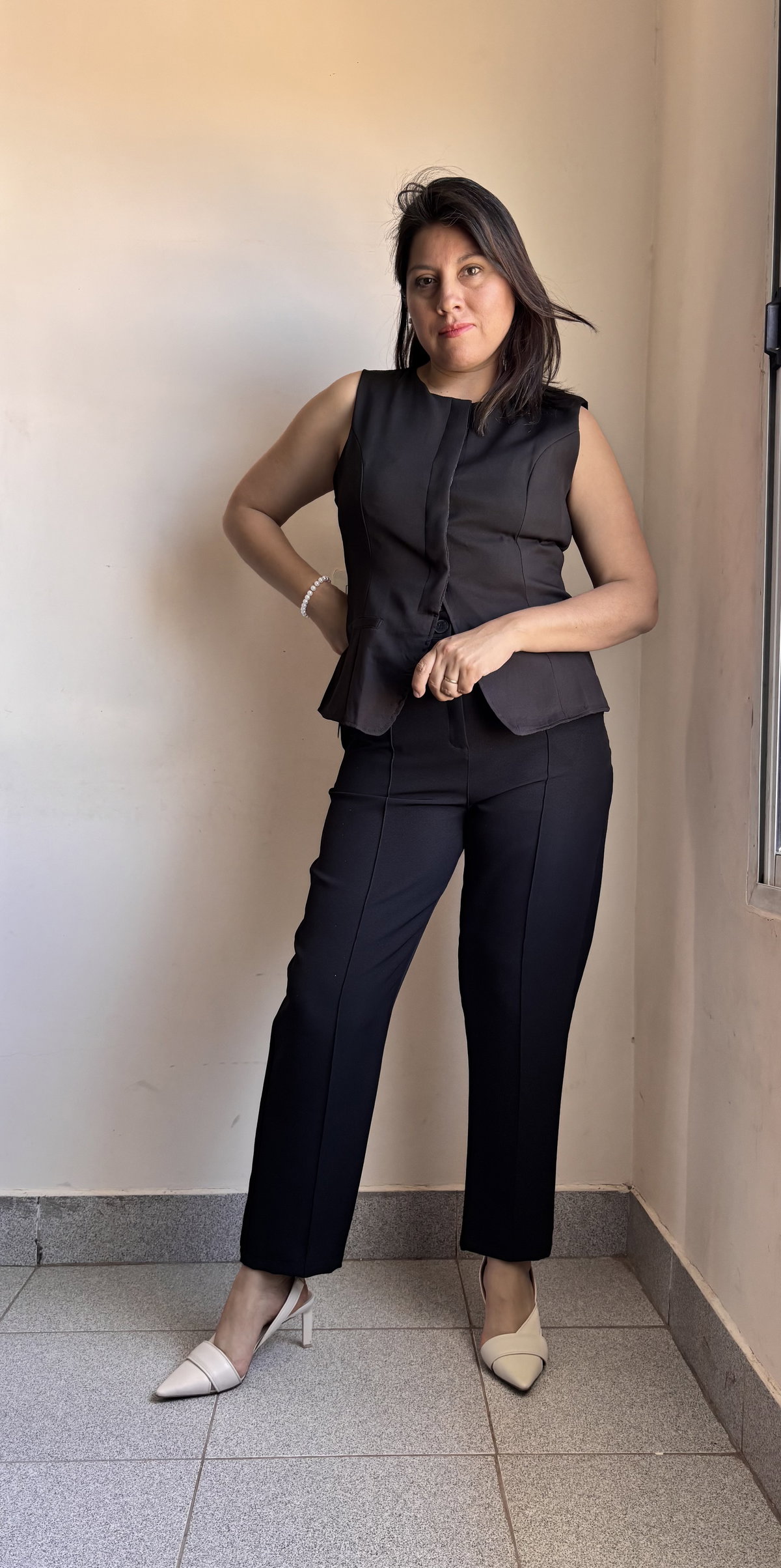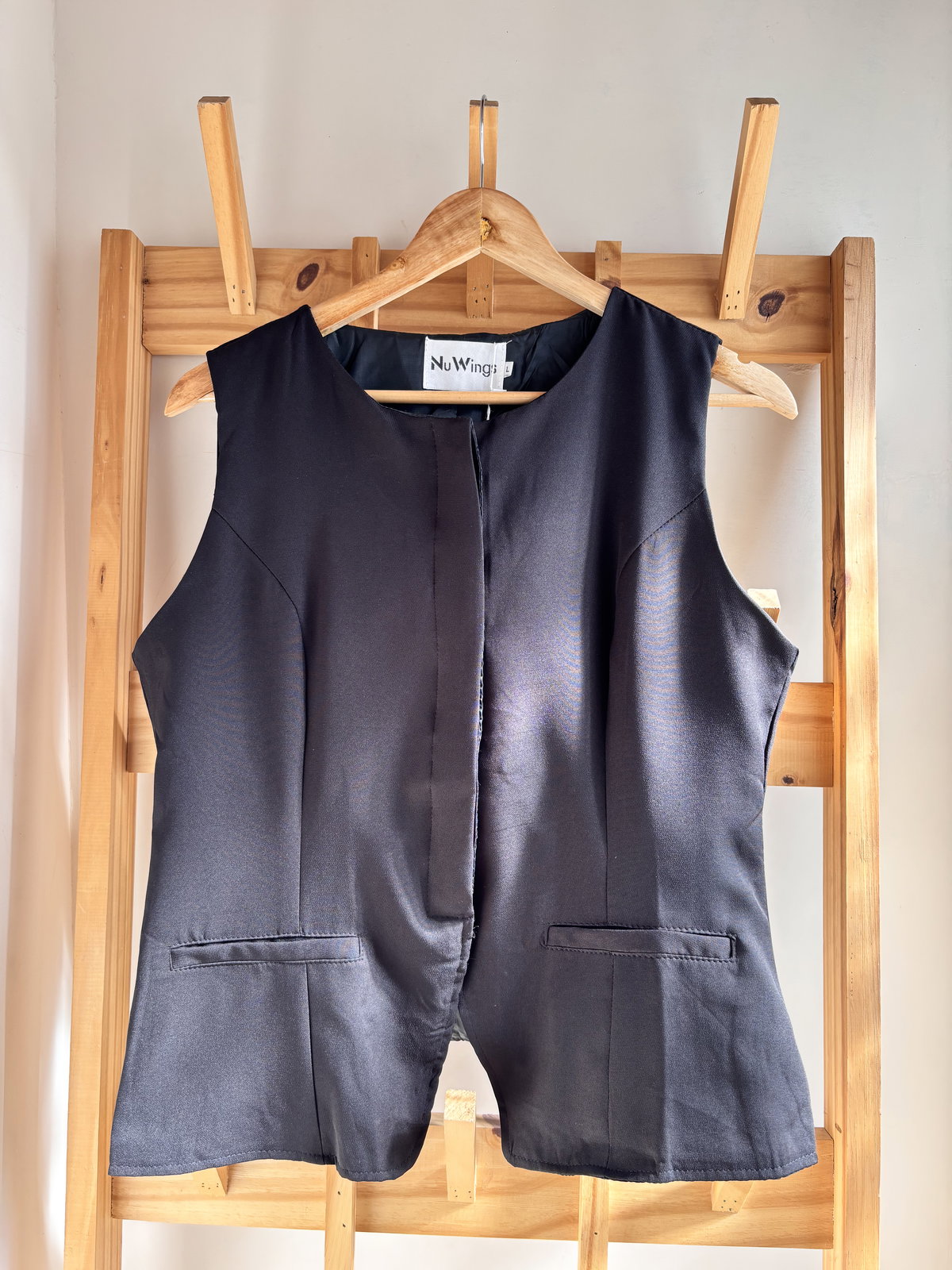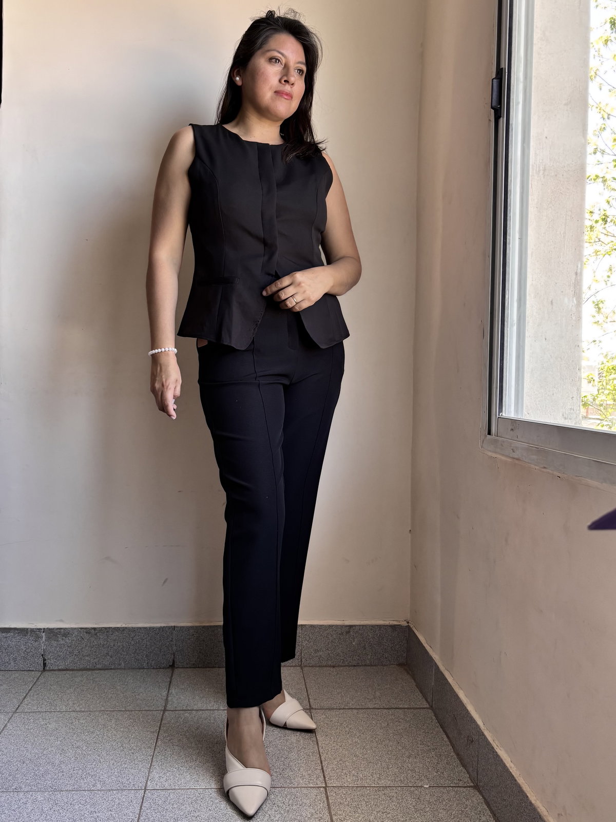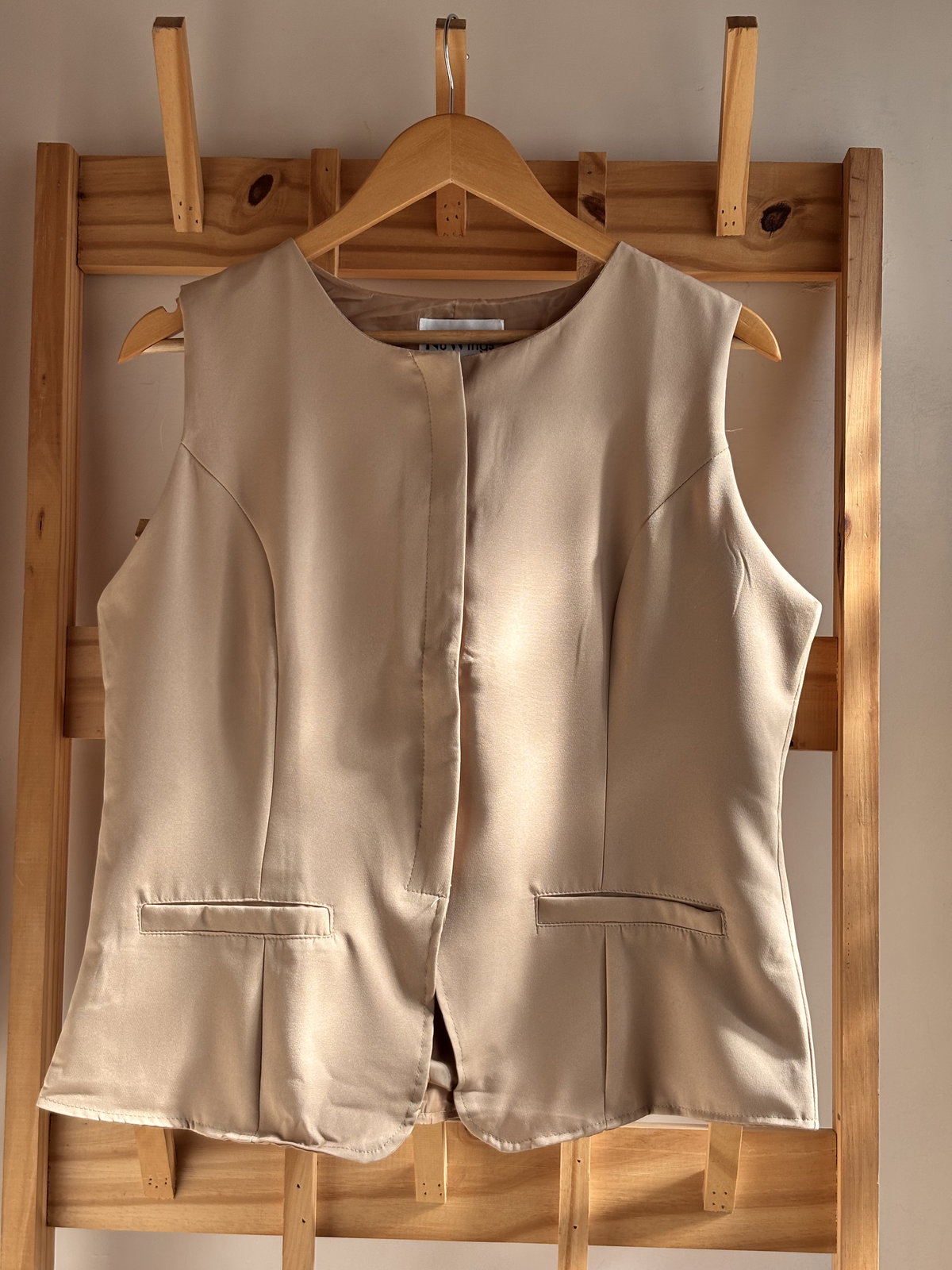 Chaleco de tela sastrera y forreria interior entallado, con bolsillos simulados, cuellos redondo y botones al frente.
