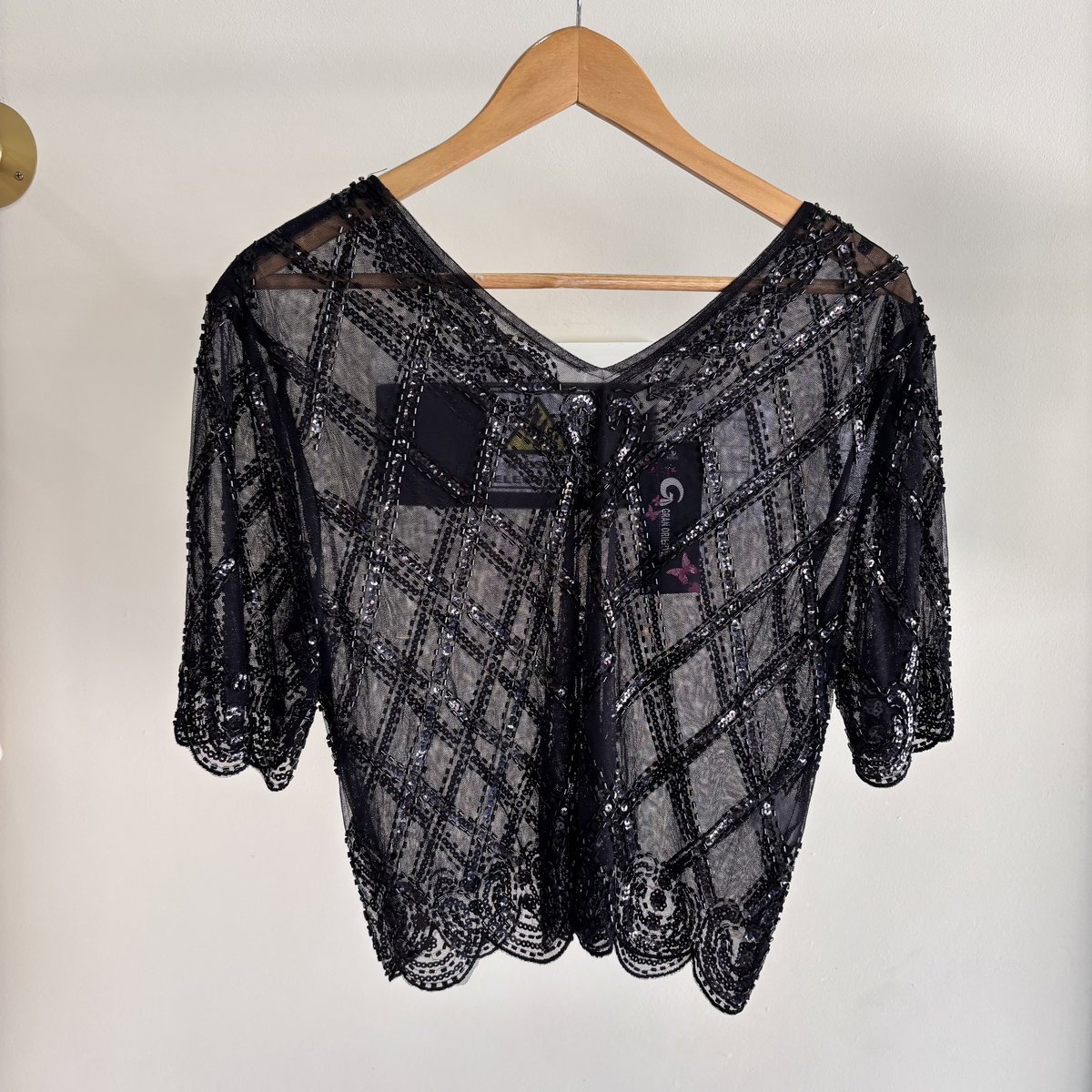 Blusa de microtul bordada de canutillos y minilentejuelas, de escote V con mangas, ideal para armar looks de fiestas y combinarlas con faldas, sastreros.