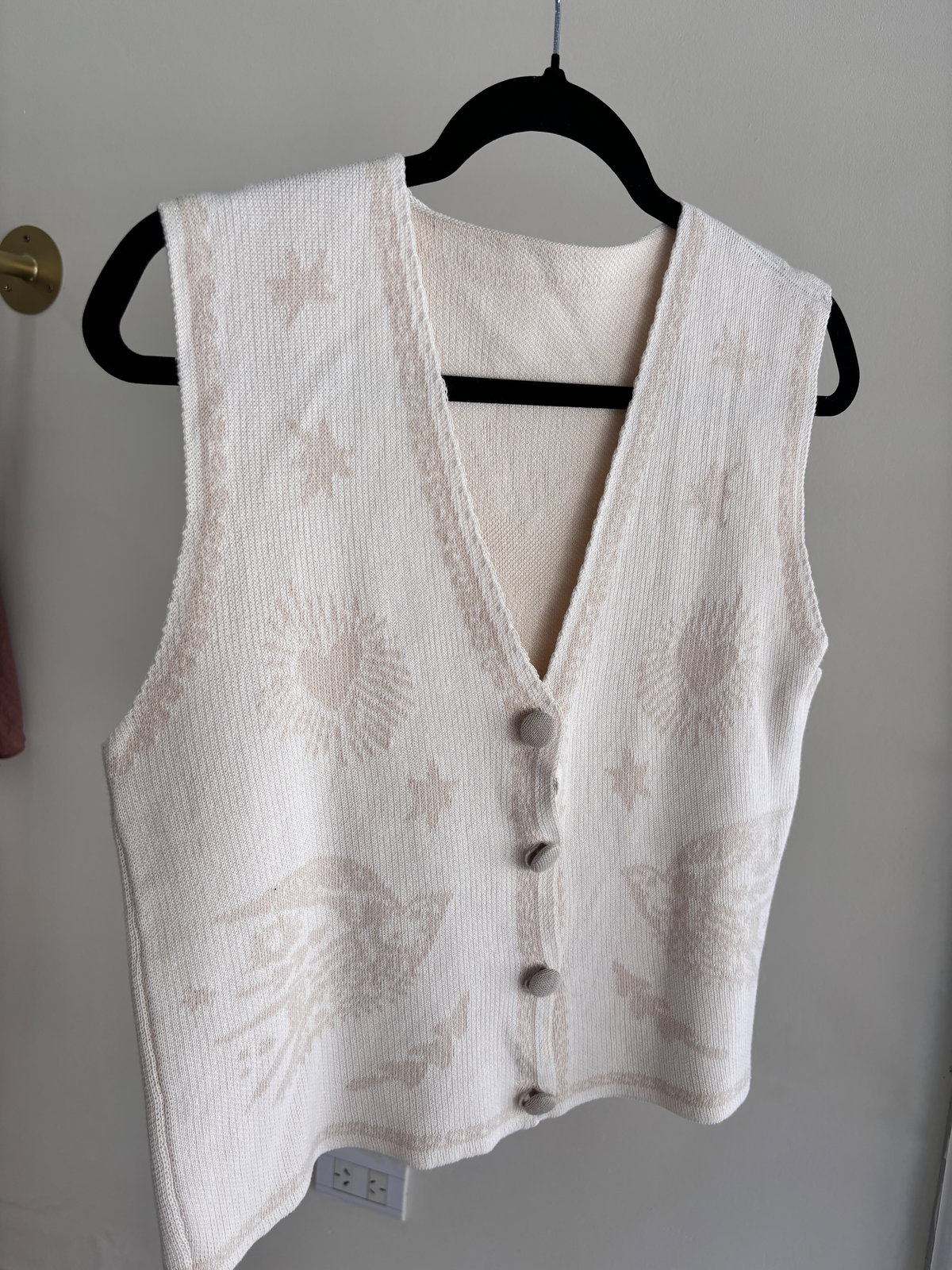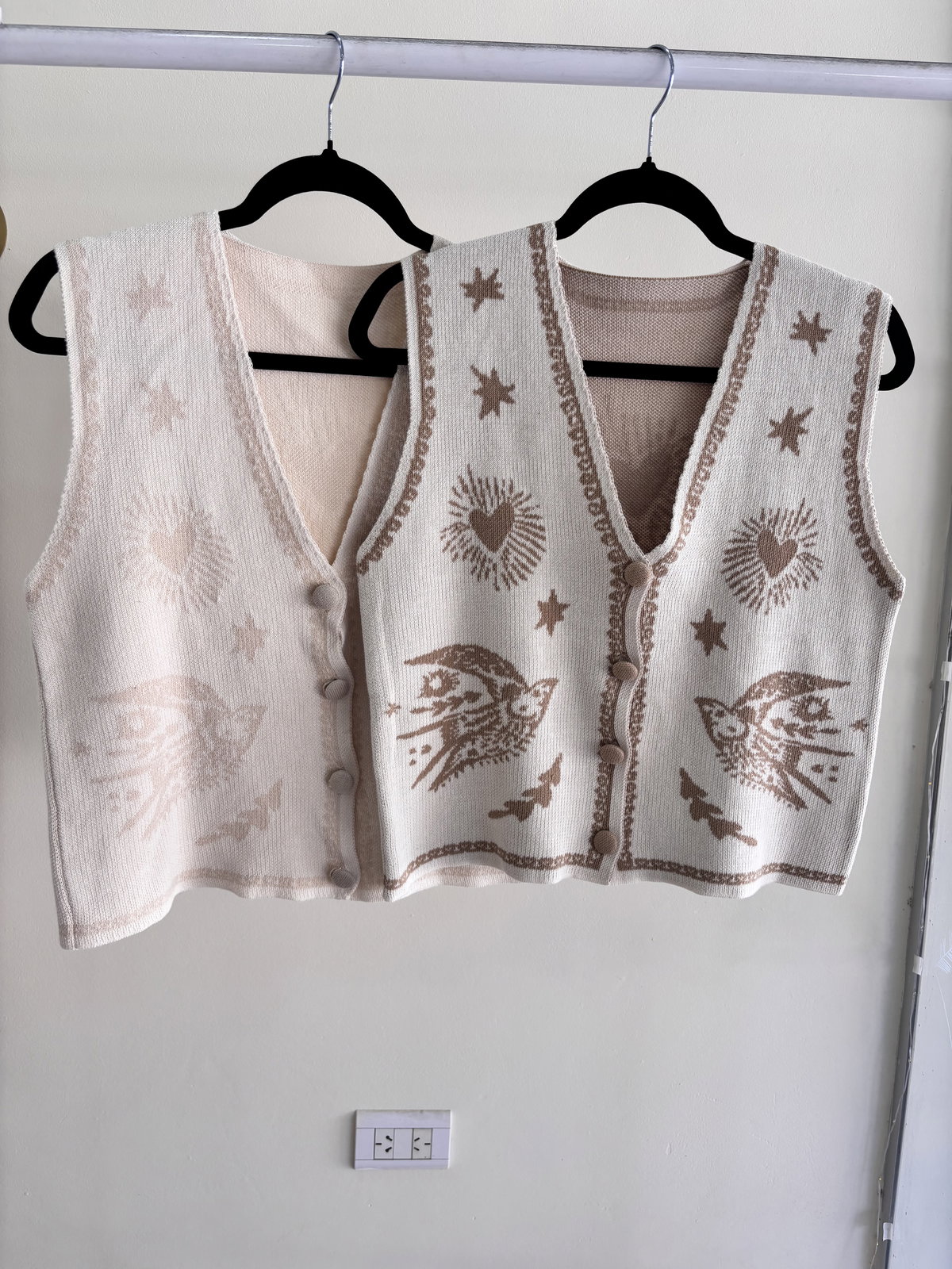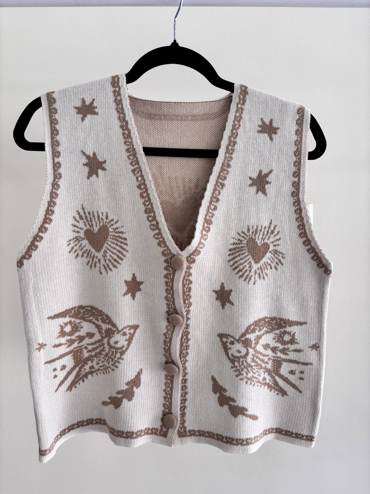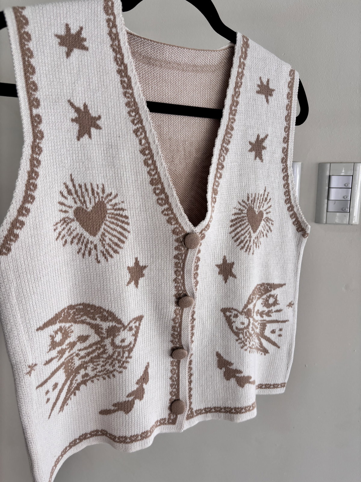 Chaleco confeccionado en algodón peinado de estilo Boho con estampa de palomas y estrellas de escote V y botones forrados.