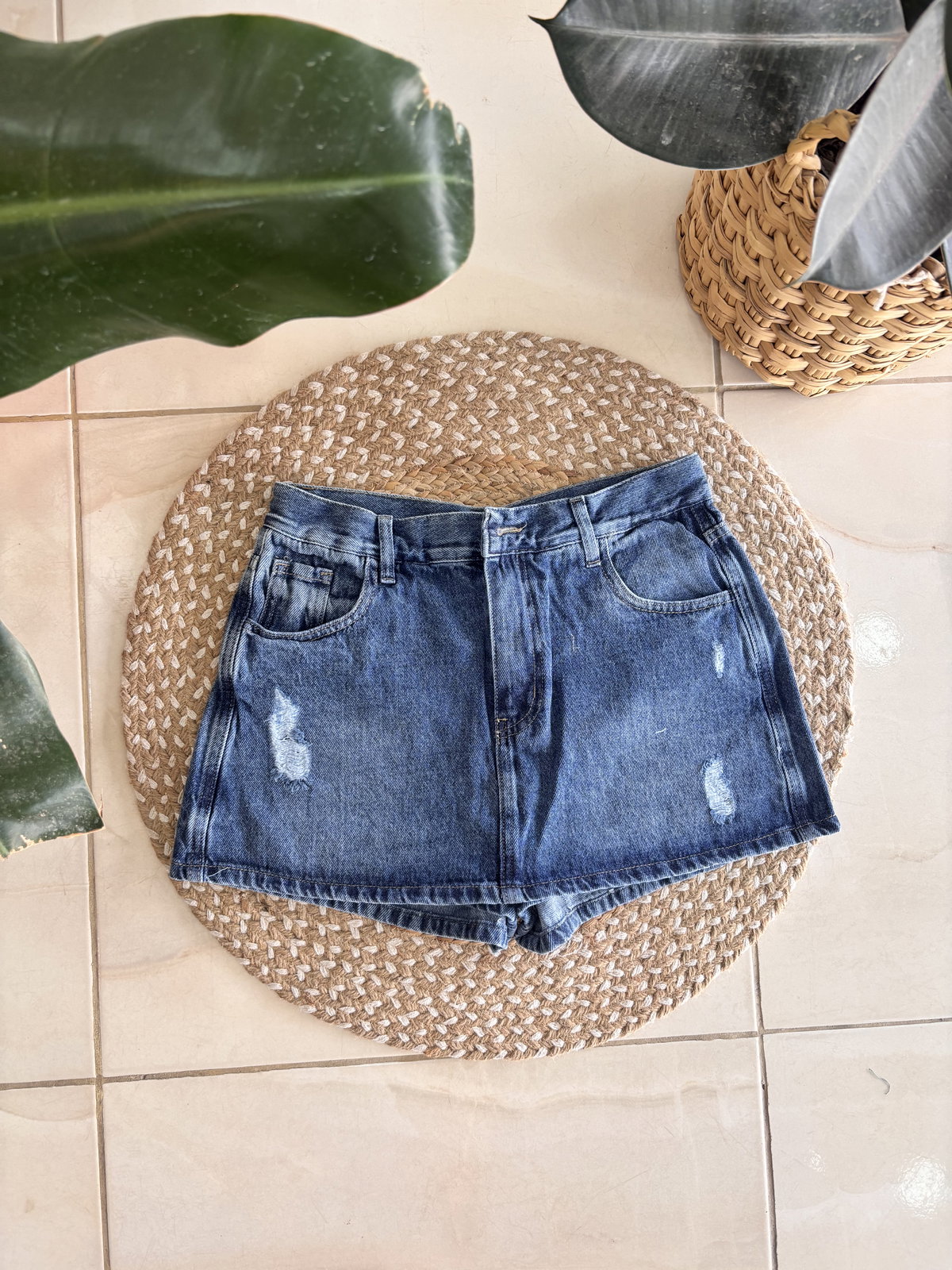 Short pollera de jeans con desgaste en la parte de adelante exelente calce y tiro alto súper comodo